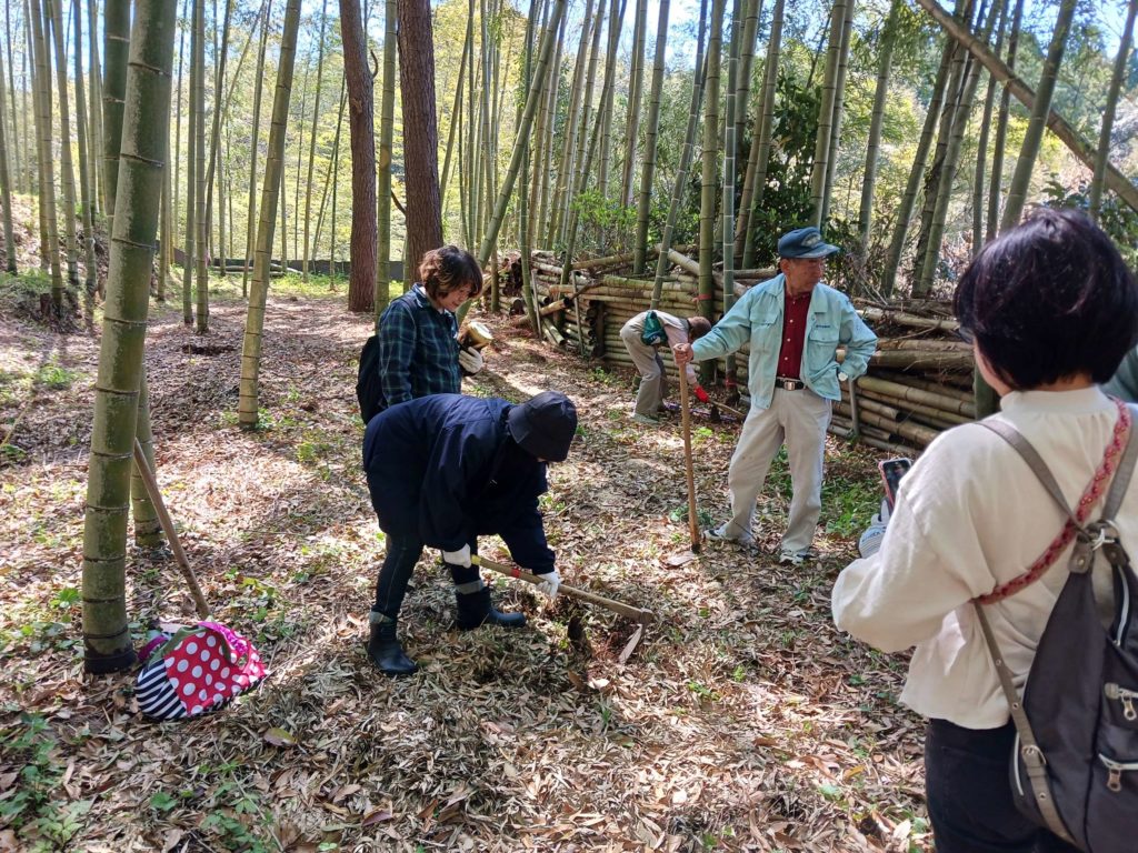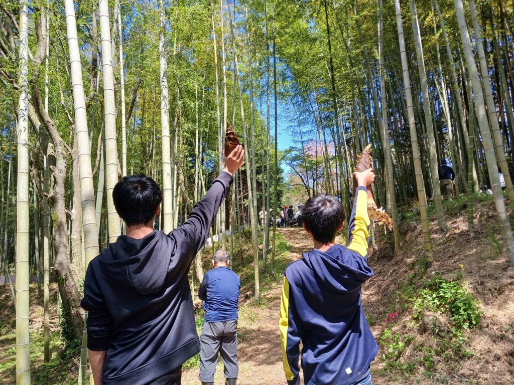 「タケノコ、山菜とるぞー!」ということで4月14日、山浦地区コミュニティセンター周辺でタケノコ狩り&山菜収穫体験が今年も開催されました。