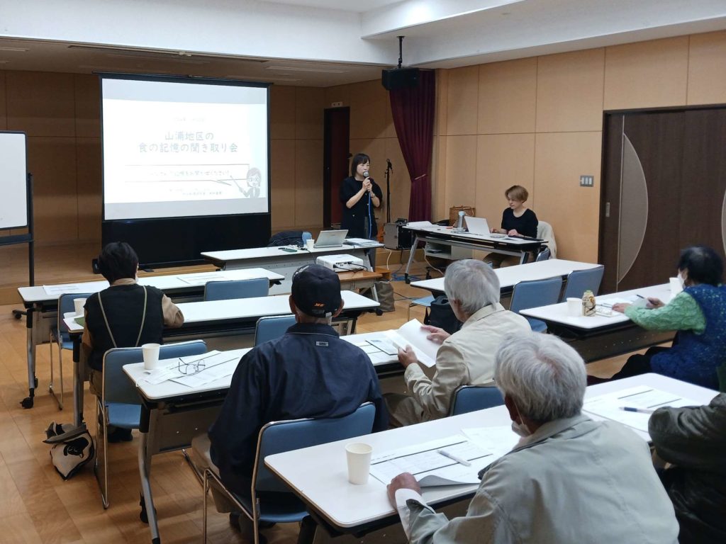 ご講師に『株式会社たべごとカンパニー』の木村真琴さんをお招きしました。木村さんは、食に関する仕事を幅広くされており、各地の文化や歴史を取り入れた料理を通して地域づくりにも貢献されています。聞き取りは、主に昭和や大正の文献に基づいて行われました。山浦のみなさんもよく知っていたり、いなかったり... 木村さんの問いかけに「ああ、『しいら餅』…あんこを入れない『素餅』のことやね」とか「芋団子…芋練り…いつでもおやつにしていたなぁ」など詳しく聞かせてくれました。