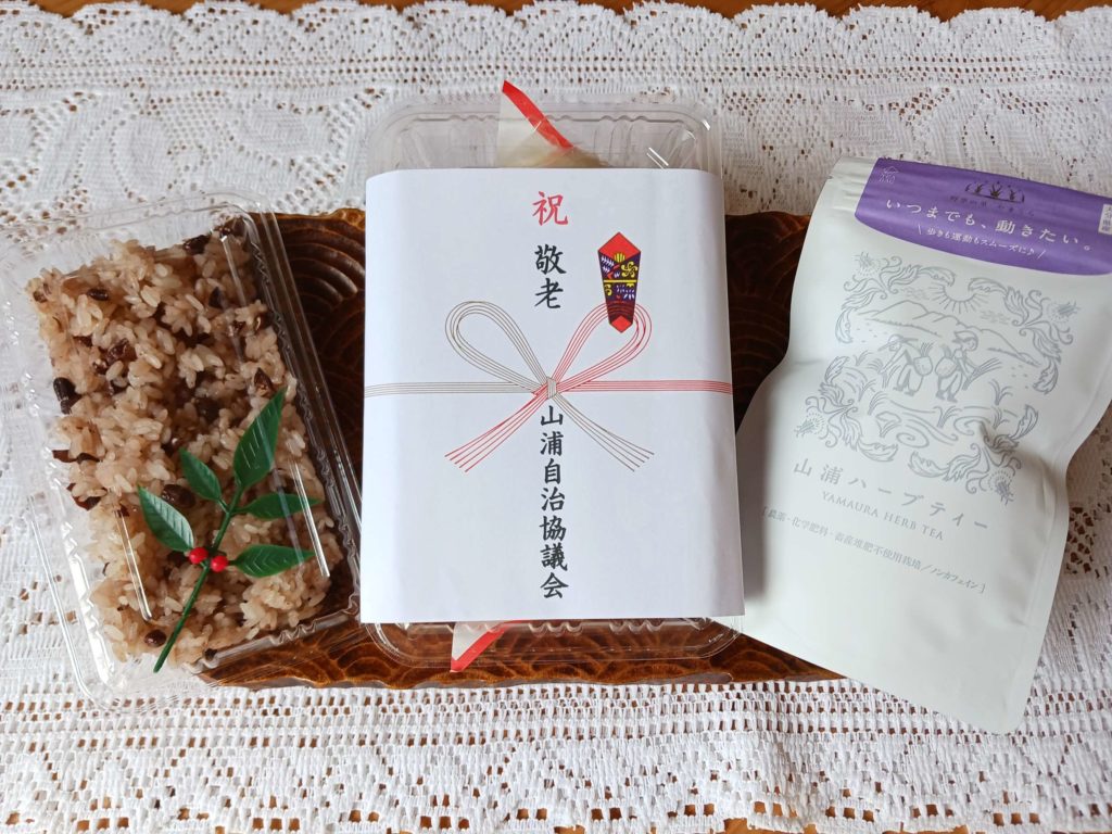 このイベントは、山浦地区のご長寿のみなさんをコミュニティセンターに招待して開かれるもので、今回で15回目を迎えました。会場では、「久しぶりやねぇ」「あなた、〇〇さんやねぇ」といった会話も聞かれ、和やかな雰囲気に包まれていました。山浦地区まちづくり推進協議会の会長さんや、ご来賓の方々からもお祝いの言葉をいただきました。記念品には紅白まんじゅうとお赤飯、それと特産の山浦ハーブティーをお渡ししました。このハーブティーは、杜仲(とちゅう)と、いのこずちを原料に「歩きも運動もスムーズに、いつまでも元気でいてもらいたい」との思いから作られたものです。
