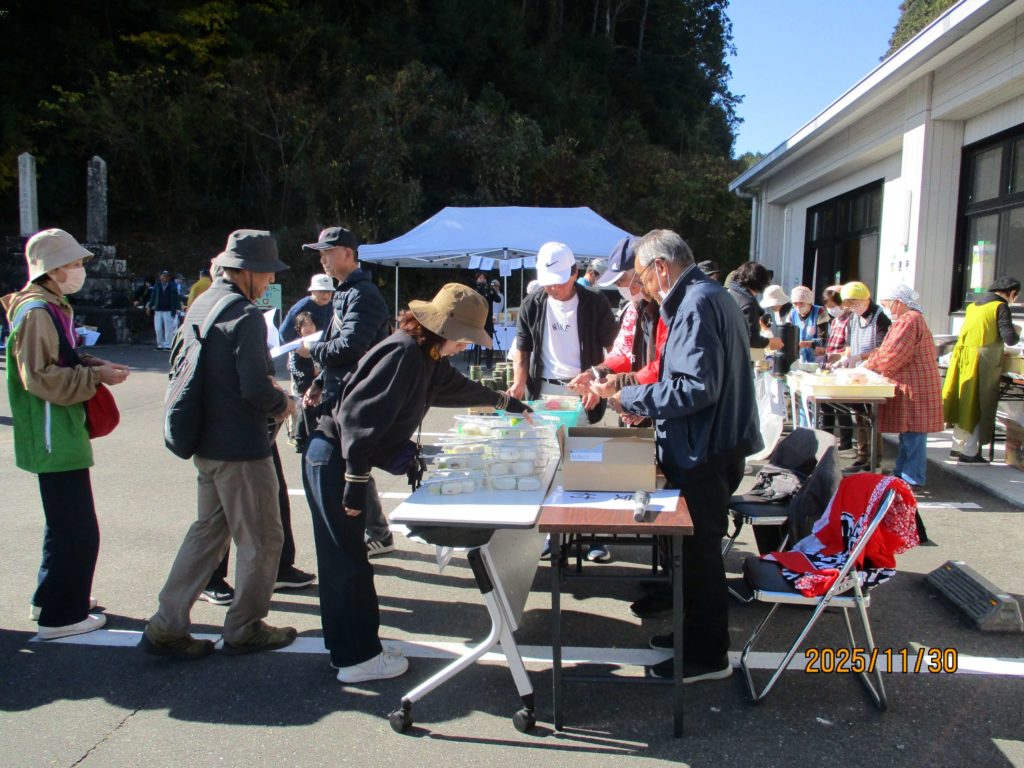 ウォークのみなさんが戻ってくる11時頃から開かれる山の市では、恒例のシシ汁や鹿肉のカレー、野草茶やお菓子などが販売されました。地元のみなさん自慢のお米や野菜など、秋の恵みも多く出品されていました。また出身地の名物を紹介する故郷物産展コーナーもありました。