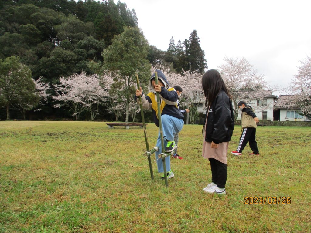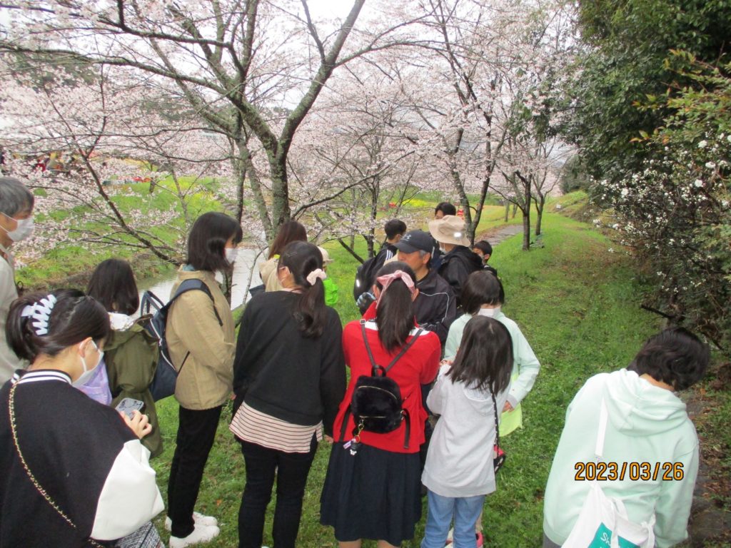 桜の木の下を通る野草ガイドや、竹馬遊び。