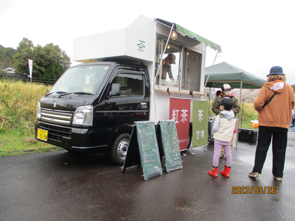 当日はあいにく小雨の中での開催となりましたが、お茶や山浦ハーブのパウンドケーキ、山浦米のおむすびなどをご来場の皆さまに味わっていただきました。外でお茶を楽しむ野点(のだて)や、杵築市からはお茶屋さんのキッチンカー、お隣の宇佐市からも黒豆コーヒー屋さんも来てくださいました。また、子どもたちが遊べる竹遊びコーナーや、公園周辺を散策する野草ガイドもご好評いただきました。今回が初めてのイベントでしたが、秋の『やまうら山の市』とあわせて、春の恒例イベントとして開催していきたいと思います。
